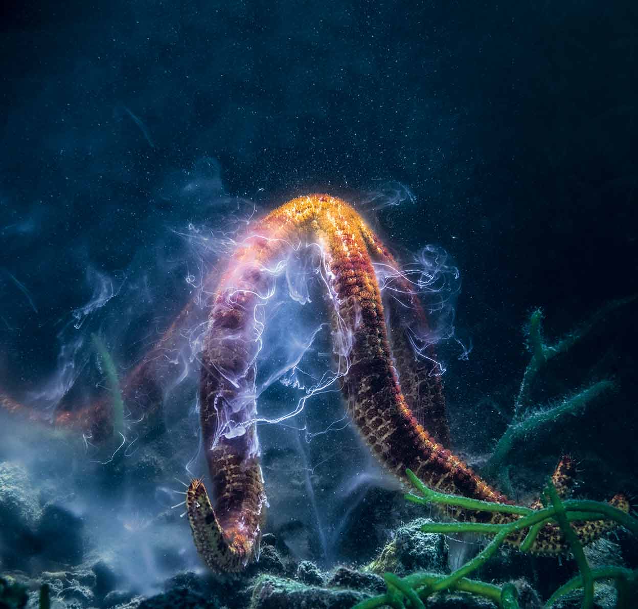 Son estrategias defensivas de unos seres que no tienen cerebro, pero sí un eficaz sistema nervioso que transmite órdenes desde los hábiles sensores que tapizan sus brazos. Peculiares, asombrosas, resistentes, así son las estrellas de mar, equinodermos de la clase Asteroidea, emparentados con los erizos y los pepinos de mar; organismos simétricos, normalmente pentarradiales, pero el número de sus brazos varía dependiendo de las especies.